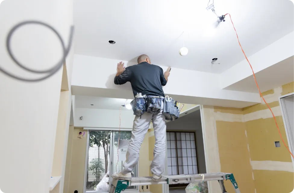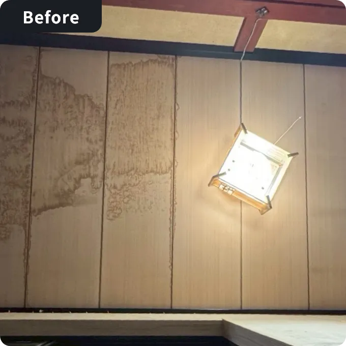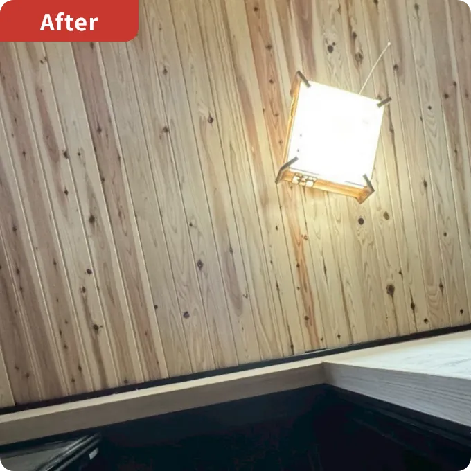 傷みや汚れが目立っていた天井を張り替え、室内全体が明るく見えるよう仕上げました。周囲との取り合い部分も丁寧に施工しています。
